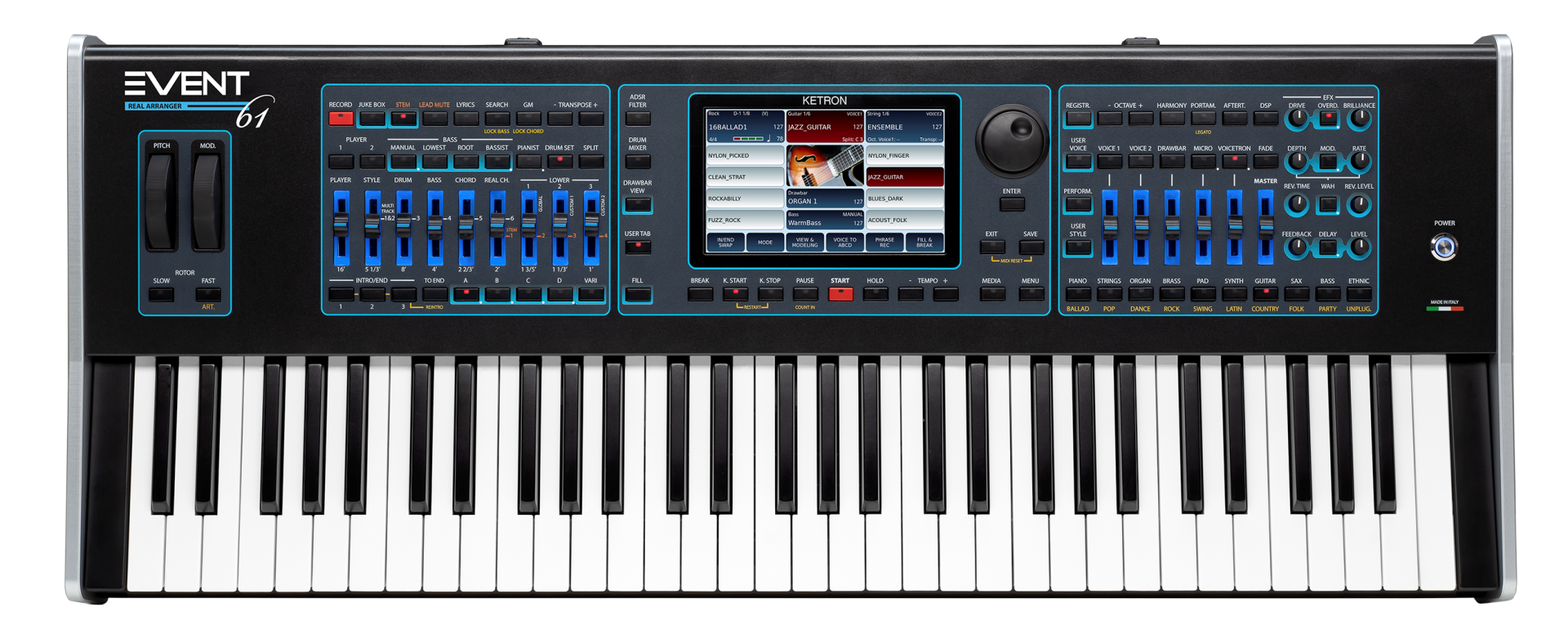 Live Drums: 580 Live Drums with a complete Arranger structure (3 Intros, 3 Endings, ABCD, 4 Fills, 4 Breaks). Reverb and 3 band Parametric Equalizer with 10 presets, programmable on each style. Drum Boost. Possibility to load external User Live Drums. Drum Lock.