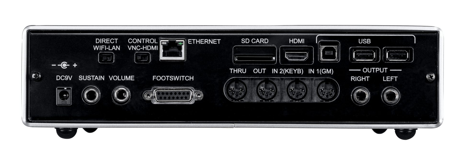 Main Out Left / Right. Sustain pedal. Volume pedal. Footswitch. Midi In1, Midi In2, Out, Thru, 2 x USB device. USB Host. HDMI, Ethernet.