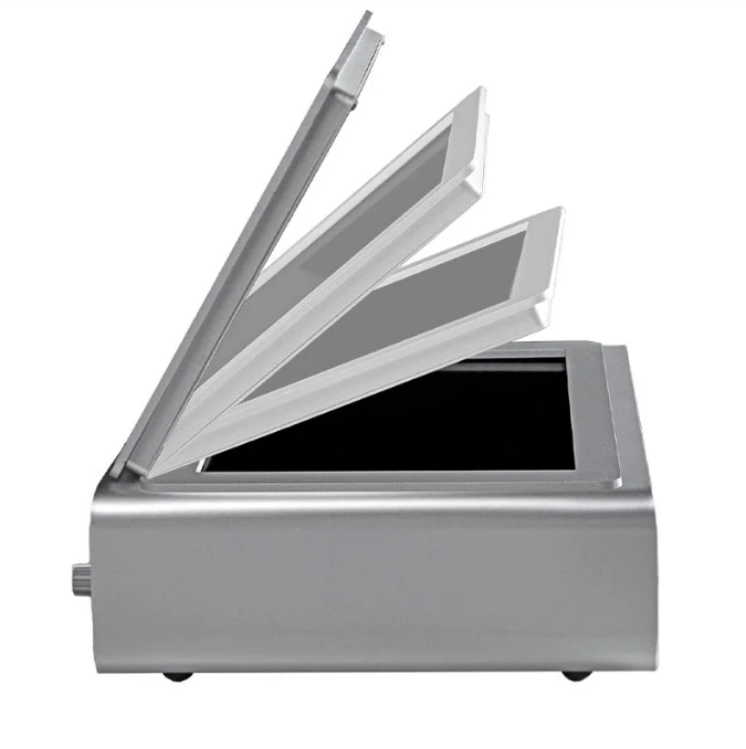 Scanner de documento com tampa articulada em três estágios, prateado e preto