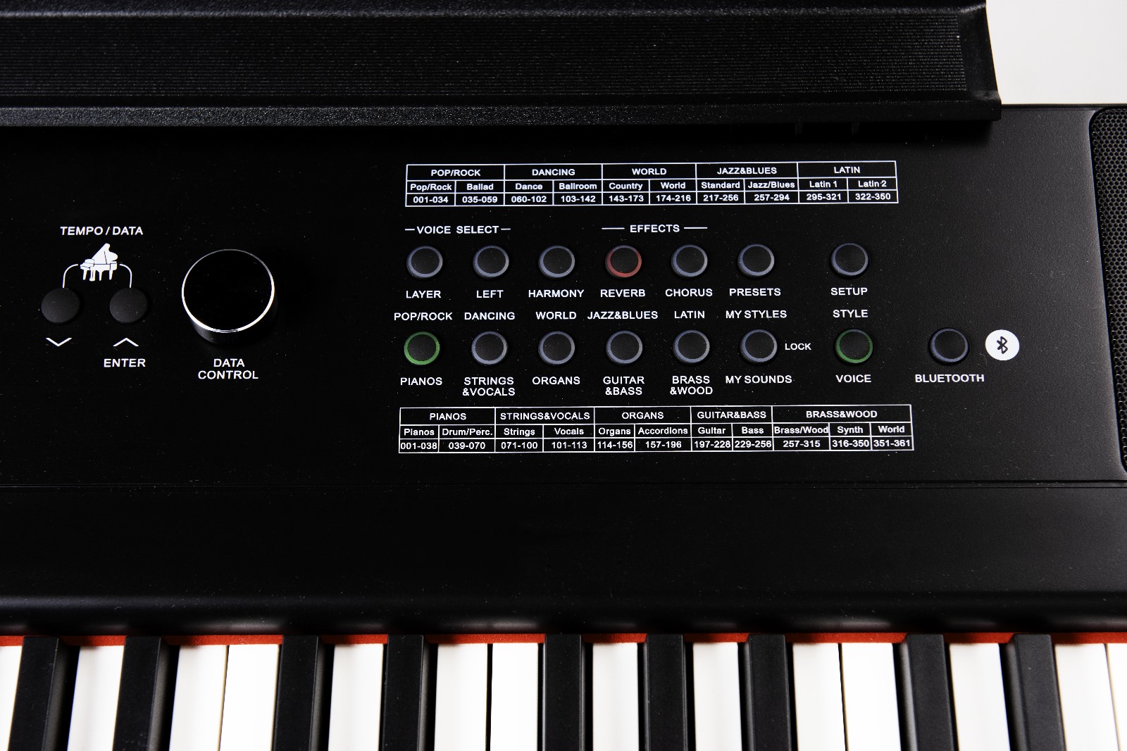 350 Styles with Auto Accompaniment, Intro, Fil In 1, Fill In 2, Ending, Tap Tempo, Sinchro. Volume controls. Memory Recordings, Full Keyboard Chord System.