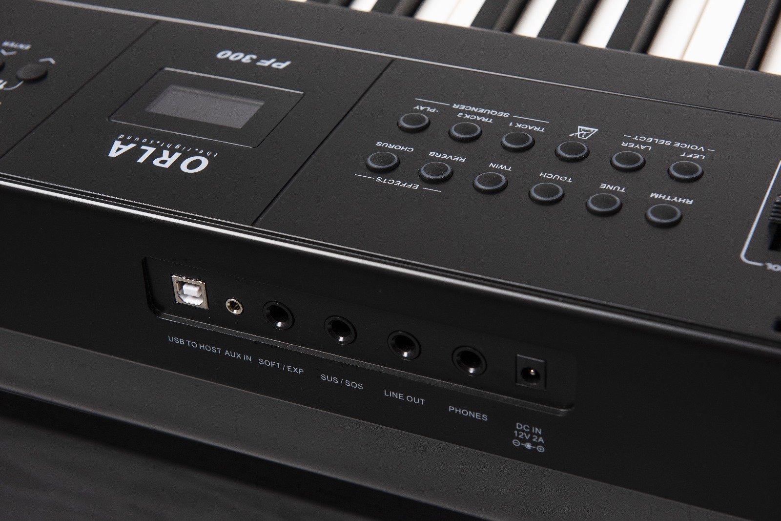 Power supply, sustain-soft-sostenuto pedals, volume pedal, headphones, line out, aux in, USB to host midi/audio.