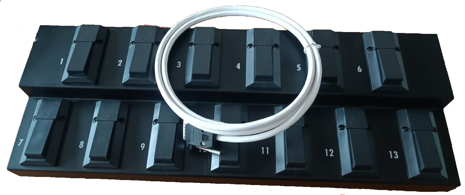 Suporte preto com 13 interruptores numerados e cabo branco enrolado